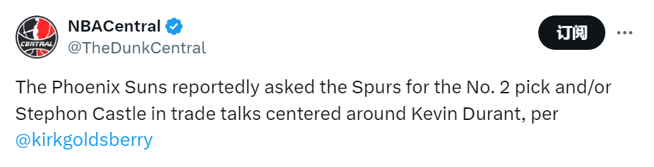 北京时间6月17日,据The Ringer记者Kirk Goldsberry报道,在关于杜兰特的交易谈判中,太阳向马刺索取的要价包括榜眼签和/或卡斯尔。此前有报道称,马刺报价非常谨慎保守,不可能为杜兰特送出这两个筹码,他们愿意给的选秀资产是14号签。