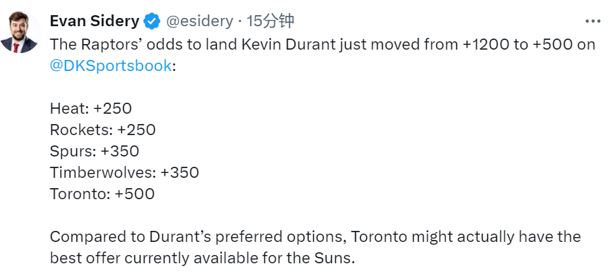 名记Sidery表示,与杜兰特的首选下家(热火、火箭、马刺)相比,多伦多猛龙队或许才是目前能为太阳队提供最佳报价的球队。此前有报道称,猛龙愿意为得到杜兰特送出巴雷特、奎克利和珀尔特尔,他们也愿意送出9号签。