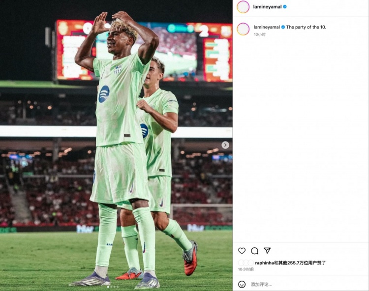 赛后,亚马尔社媒晒照并配文写道:10号的派对。